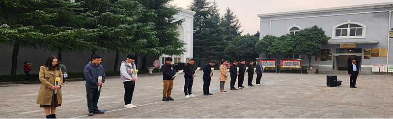 活動現場,清風徐徐,靜謐肅穆,大家帶著無限敬意,駐立默哀,表達對革命先輩的敬仰與追思,全體人員列隊肅立,鞠躬默哀并敬獻花籃。