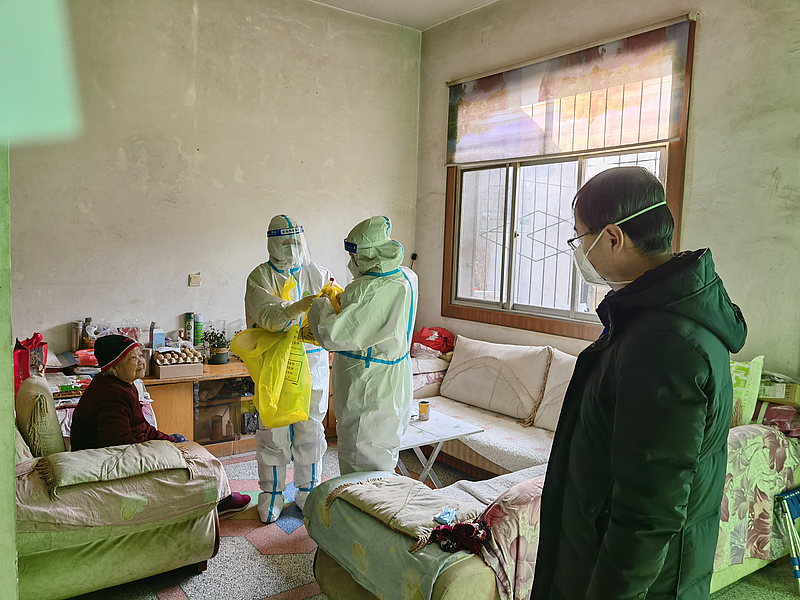 李杭嶧協(xié)助醫(yī)護人員入戶采集核酸