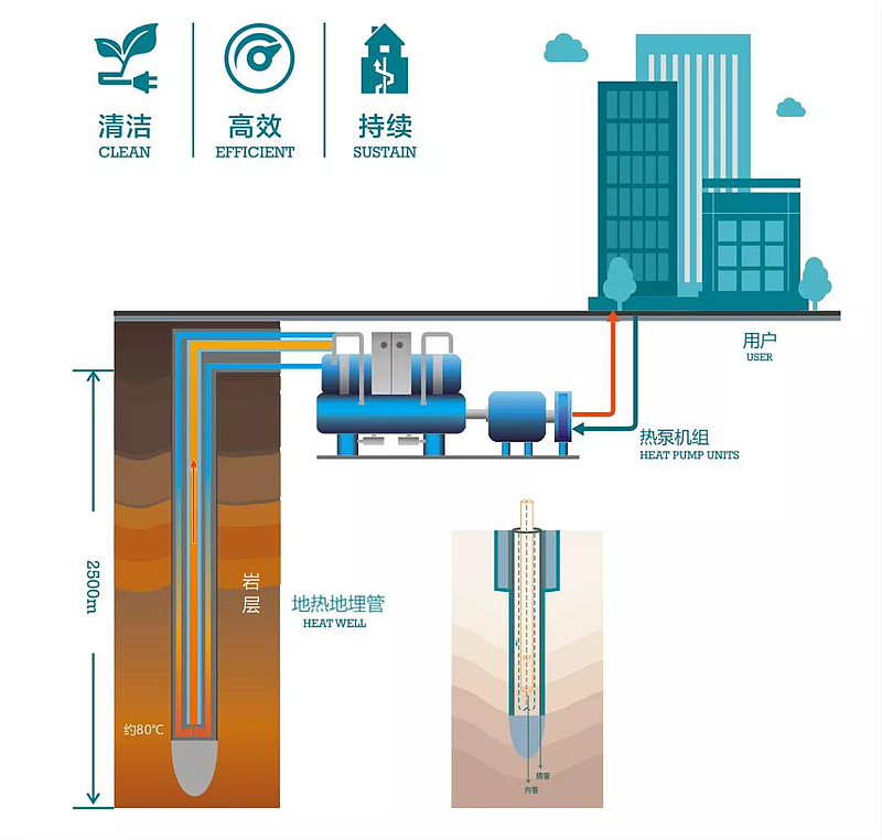 集成應用現代鉆采技術、熱泵技術和建筑節能保溫技術,實現了技術閉環,形成了獨具特色的新一代區域低溫供熱系統——中深層無干擾地熱能供熱技術系統,將過去不能開采利用的自然地熱資源,變成可供人們利用的經濟資源,使地熱資源的規模成百上千倍地增加。