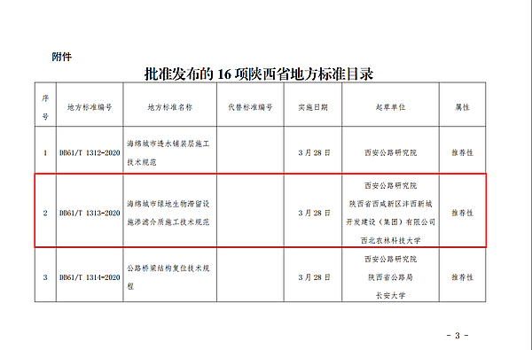 日前,陜西省市場(chǎng)監(jiān)督管理局批準(zhǔn)發(fā)布了16項(xiàng)陜西省地方標(biāo)準(zhǔn),并于3月28日正式實(shí)施。由灃西集團(tuán)、西安公路研究院、西北農(nóng)林科技大學(xué)聯(lián)合編制的《海綿城市綠地生物滯留設(shè)施滲濾介質(zhì)施工技術(shù)規(guī)范》(DB61/T1313-2020)位列其中,這是灃西集團(tuán)承擔(dān)的10余項(xiàng)海綿城市省級(jí)地方性標(biāo)準(zhǔn)編制任務(wù)中首批成果。