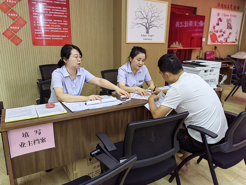 現場簽到、房屋分配、繳納維修基金、填寫業主檔案、系統信息錄入......每個環節都井然有序。高效的背后,是物業公司踐行細節與標準,提升業主收房體驗感的表現。小區大門放置紅色拱門,恭祝業主喬遷之喜;物業前臺懸掛“恭迎二期業主回家”橫幅,營造良好收房氛圍;在單元門口張貼海報,提供暖心服務。每個工作人員也都以飽滿的精神狀態投入工作?!澳茫瑲g迎回家”是交付現場最常聽見的一句話,也是最暖心的一句話,為所有交付業主帶來親切的體驗。