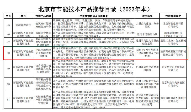 北京市節(jié)能技術(shù)產(chǎn)品推薦目錄是由相關(guān)專家對(duì)節(jié)能技術(shù)產(chǎn)品進(jìn)行綜合評(píng)審所形成的,涵蓋建筑圍護(hù)結(jié)構(gòu)、供熱鍋爐系統(tǒng)、空調(diào)通風(fēng)系統(tǒng)、照明和采光系統(tǒng)、電力電氣技術(shù)、數(shù)據(jù)中心節(jié)能技術(shù)、能源管理系統(tǒng)、新能源與可再生能源利用等領(lǐng)域的53項(xiàng)節(jié)能技術(shù)產(chǎn)品目錄。能源公司的中深層地?zé)崮軣o(wú)干擾清潔供熱技術(shù),具有“取熱不取水”的特點(diǎn),系統(tǒng)能效可達(dá)4.0以上,比傳統(tǒng)淺層地源熱泵節(jié)能30%以上,節(jié)能效益顯著。