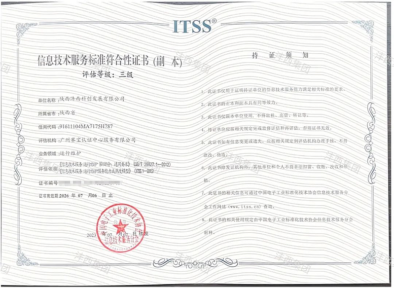 近日,灃西集團(tuán)科創(chuàng)發(fā)展有限公司(以下簡稱“灃西科創(chuàng)”)順利通過中國電子工業(yè)標(biāo)準(zhǔn)化技術(shù)協(xié)會審核,獲ITSS信息技術(shù)服務(wù)運(yùn)行維護(hù)三級資質(zhì)證書。