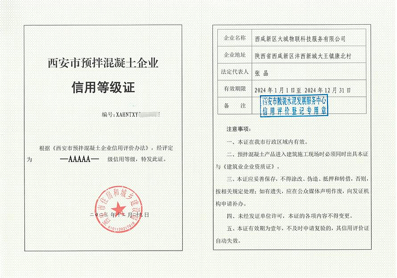 大城公司以開展質量、環境、職業健康安全三標管理體系建設為契機,持續推進制度建設全面化和業務流程規范化,于11月底順利通過2023年度西安市預拌混凝土企業信用評價現場審核,獲評“5A”信用等級(最高級),標志著大城公司在精細化、制度化、規范化管理方面邁上新臺階,有效提升公司品牌價值和核心競爭力。