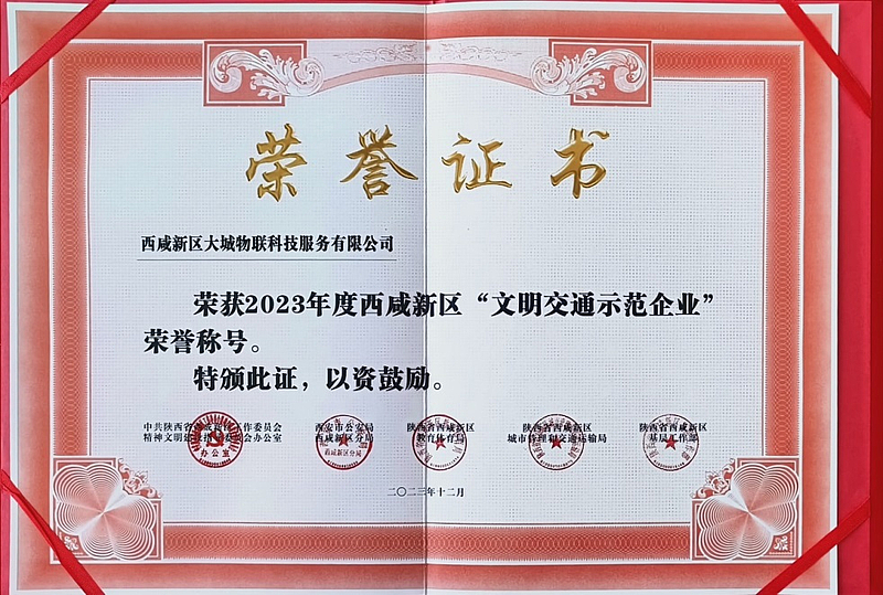 在西咸新區開展的2023年度文明交通示范集體和先進個人創建評選活動中,大城公司榮獲“文明交通示范企業”榮譽稱號,公司1人榮獲“安全管理先進個人”稱號,2人榮獲“文明交通優秀駕駛人”稱號。長期以來,大城公司秉承創新理念,將科技創新和應用實踐相結合,不斷優化交通安全管理智能化解決方案,助力新區打造安全高效的現代交通體系。