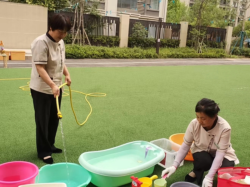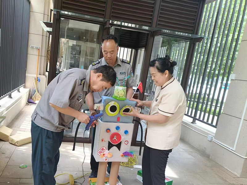 多彩童年,歡樂無限,校園的每個(gè)角落都充斥著節(jié)日的喜悅。灃西同禮幼兒園的保潔和秩序維護(hù)員利用工作空閑時(shí)間將平日收集的紙箱、飲料瓶等變廢為寶,為活動(dòng)場地加上一抹不一樣的色彩;灃西第十幼兒園的保潔早早將水盆和水桶里蓄滿水,為打水仗活動(dòng)做好充足的物資供應(yīng);創(chuàng)新港西安交通大學(xué)附屬小學(xué)的項(xiàng)目人員幫助學(xué)校老師為孩子們準(zhǔn)備精美的節(jié)日禮物;灃西第七小學(xué)的保潔耐心地把孩子的創(chuàng)意手工繪畫作品展擦洗至干凈無塵……他們以愛為底色,用心做好“學(xué)苑管家”。