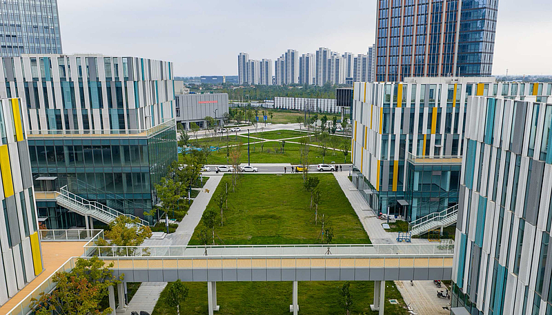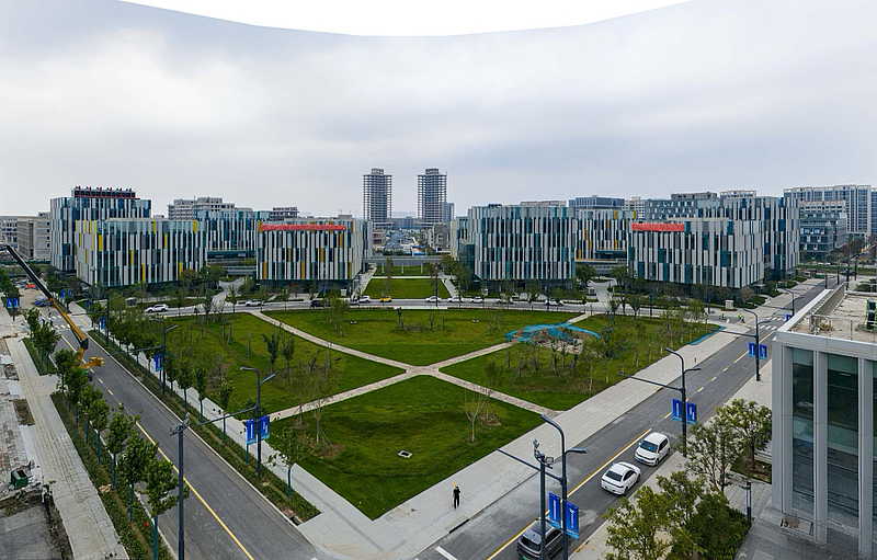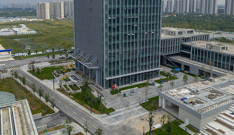 當(dāng)?shù)谝豢|晨光照亮絲路科創(chuàng)谷起步區(qū)的玻璃幕墻