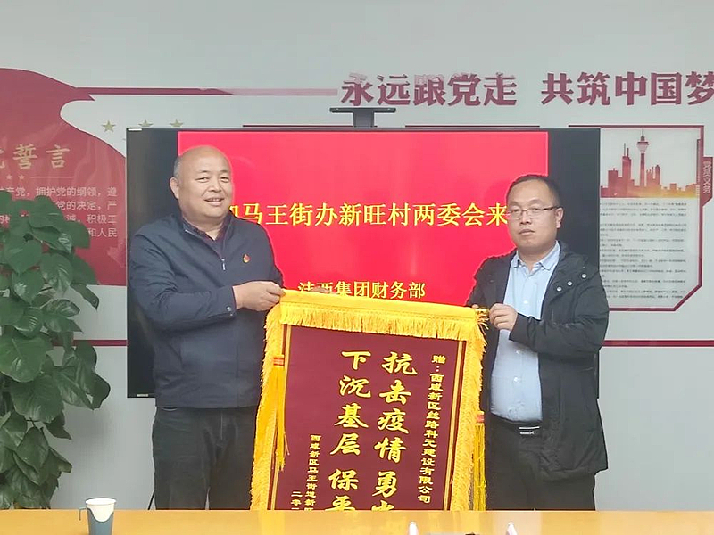 4月2日,灃西新城馬王街道新旺村總支部書記、村委會主任葛東武代表“兩委”班子和村民,分別向灃西集團財務部、科元公司送來寫有“鼎力相助勇擔當 風雨同舟抗疫情”“抗擊疫情勇當先 下沉基層保平安”的錦旗,并向集團下沉干部頒發榮譽證書,感謝他們在疫情防控期間為保障新旺村群眾生命安全所做的貢獻。灃西集團總經理助理、財務部部長王莉和科元公司下沉干部代表一起接受錦旗,并和新旺村“兩委”班子座談交流。