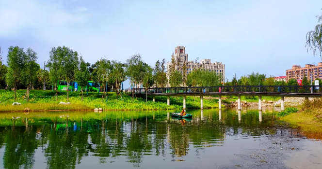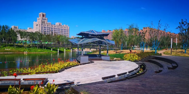 綠楔穿過五條交叉道路,被分割為六個地塊,并設五座景觀廊橋連接湖系兩岸,駁岸內園路采用再生骨料鋪設的環保生態步行道把各個景觀節點串聯起來,匯聚成自然連接的統一體,為師生提供四通八達的路網系統。項目建有管理用房、田徑運動場、籃球場、足球場、網球場等多處運動健康設施。設置的放映廳、兒童樂園、荷影廳等功能性景觀節點,滿足師生運動、休閑、觀賞、晨讀、生活需要。占有7000平方米的中心湖系,增加了校園的寧靜和師生心情上的愉悅,與周圍學校建筑樓群相得益彰。